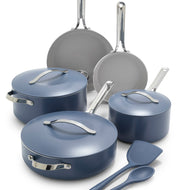 Finished in bold hues that elevate every space, this 10-Piece Cookware Set from GreenPan Nova includes all you need to cook with confidence. The induction ready design delivers even heating on all stovetops while the oven safe aluminum lids add extra durability.
