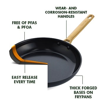 As the inventors of ceramic nonstick, we’re proud of the things we don’t put in our pans. Our Thermolon™ coating won’t release toxic fumes when overheated and creates 60% less CO2 than traditional nonstick during the curing phase. It lasts longer, performs better, and it makes every meal healthier. Healthy cooking starts with GreenPan.