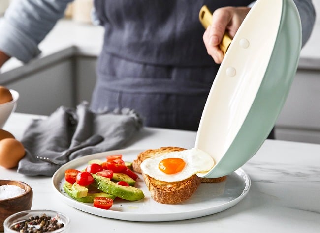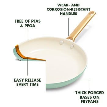 As the inventors of ceramic nonstick, we’re proud of the things we don’t put in our pans. Our Thermolon™ coating won’t release toxic fumes when overheated and creates 60% less CO2 than traditional nonstick during the curing phase. It lasts longer, performs better, and it makes every meal healthier. Healthy cooking starts with GreenPan.